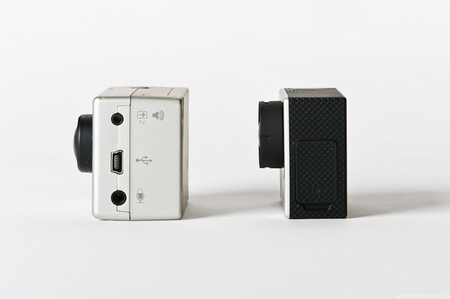 На обратной стороне разместился разъем для аксессуаров - батарейного блока или LCD-экрана. Эти аксессуары от Hero 2 подходят без проблем. Аккумулятор камеры стал компактнее, но емкость литиево-ионного аккумулятора составляет 1050 мА/ч, что на 50 мА/ч меньше, чем у Hero 2. Крышка батарейного отсека тоже пропорционально уменьшилась, и получила новый фиксатор. Также уменьшился формат карты памяти: вместо стандартной SD, третья камера снимает на Micro SD - максимальная емкость карты 64 гб, против 32 у прошлой версии. Все модели Hero третьего поколения получили новую 6-и элементную асферическую оптику. Новый объектив делает картинку более четкой и дает меньшие искажения по краям кадра.